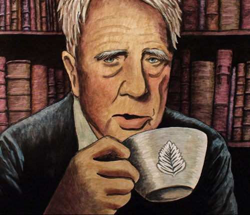 Robert Frost (1874–1963) was a poet and educator from San Francisco, California. When he was eleven, he and his family moved to Massachusetts. Eventually he ended up teaching English at Amherst College, where I lived for many years. Of the four historical heroes, Robert Frost was from a more “modern” era, so I decided to give his portrait a more colorful treatment than the others.