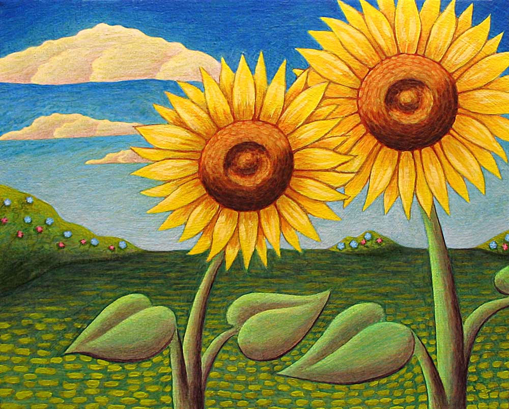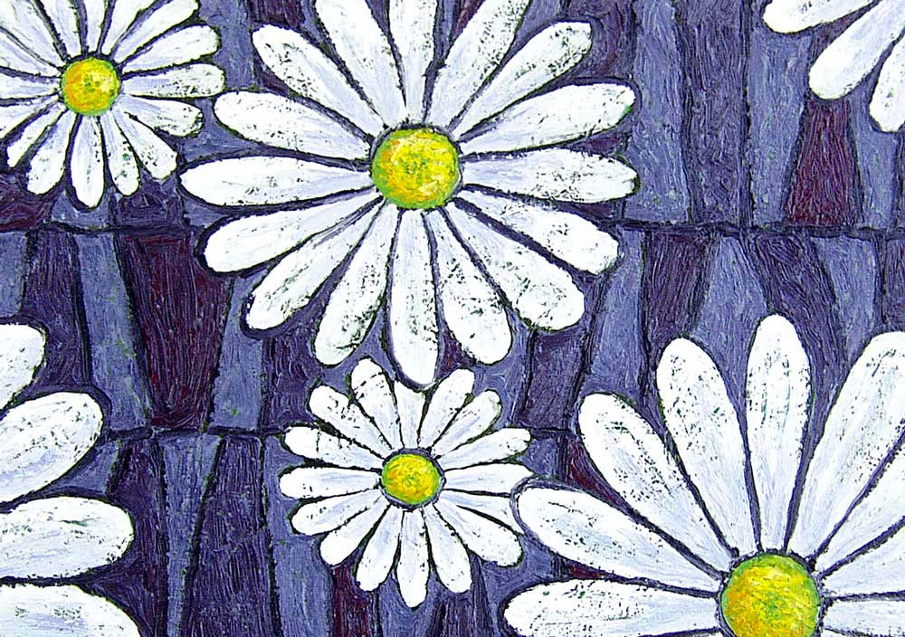 Below, I interpreted the spirit of daisies in a much more stylized way. I love how the north-south divisions in the background contrast with the radial divisions of the daisy petals. I donated this piece to the Second Annual Benefit Auction sponsored by 20things.org (website no longer active) to benefit Cancer Connection in Florence, Massachusetts. The painting was won by a wonderful person named Daisy. She loves me… She loves me not…