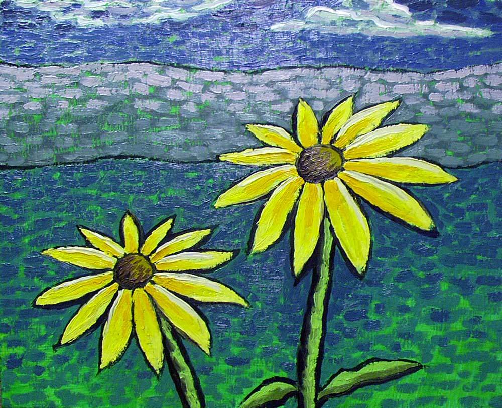 Several of the paintings in this series involved flowers. They’re such an interesting subject, what with all the repetition, pattern, and color. This one stylistically interprets a couple of black-eyed susans—one of my favorite flowers. I painted this pair of beauties using oil paint, mixed with just enough medium to make it malleable. In this way, I was able to render the scene in an impasto style, where the brush strokes are very three-dimensional, thick, and textural.